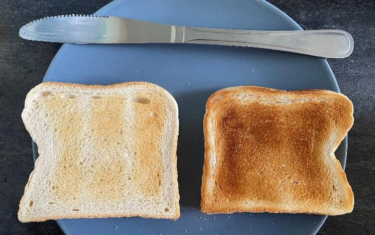 An example from our camping vacation illustrates an analogy. Our toaster was set to intensity level 3 out of 6, and in the picture you can see the first toast (left) and the third toast (right). The duration of exposure to the selected intensity level was the same. However, the operating time of the heating coil increased, meaning that the respective starting temperature also influenced the degree of browning of the toast. Indirectly, therefore, the uninterrupted operating duration of the toaster played a role. The browning of the toast can be seen here as analogous to internal load - roastet: