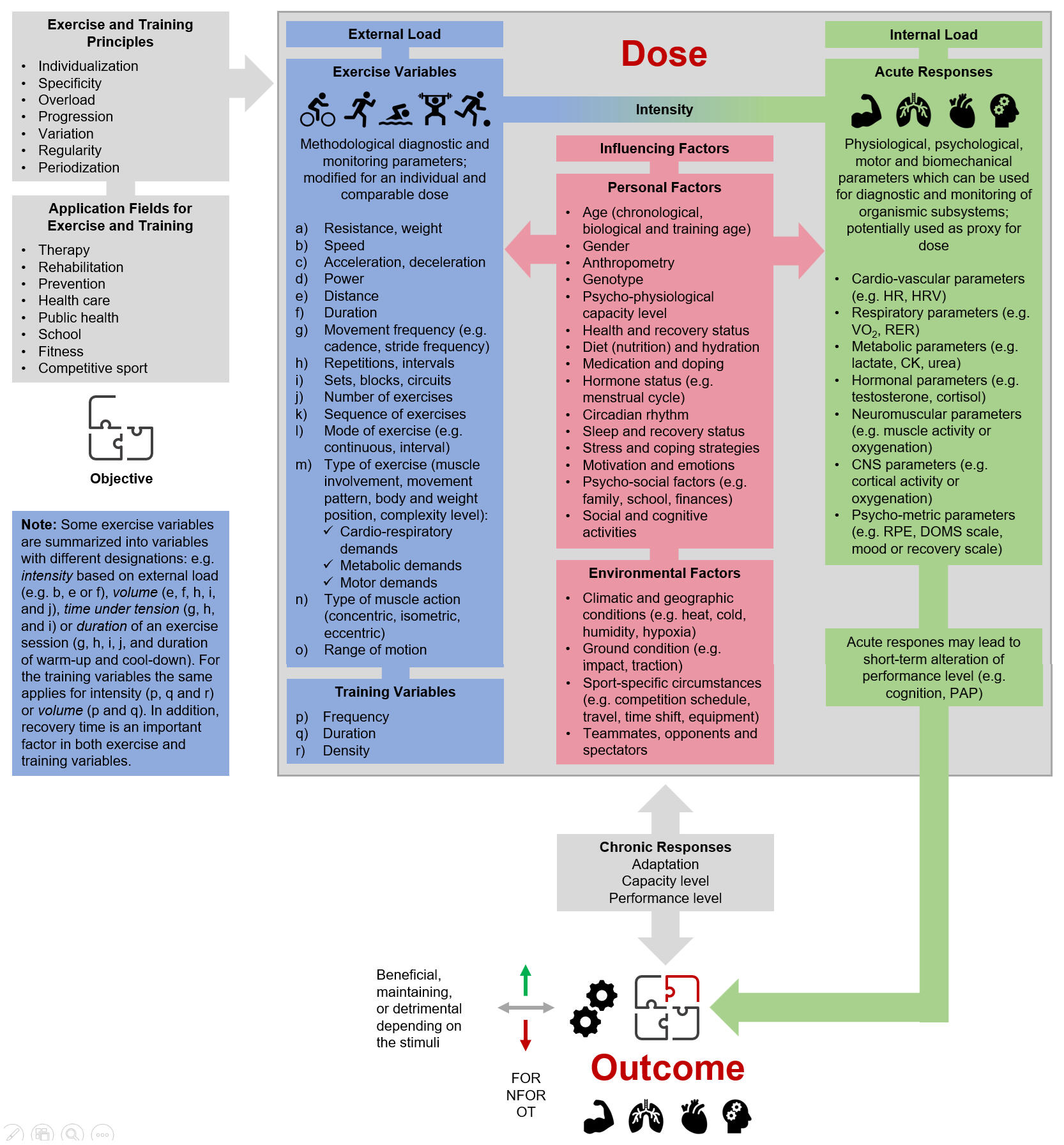 Below an overview of relevant factors for individual physical exercise and training prescription based on specific objectives and the respective context in the varying fields of application can be found, as well as principles for the programming and monitoring of physical exercise and training. The dose–outcome relationship, which will be defined later in the text, depends on a multitude of factors, such as factors of external and internal load and influencing factors (HR: heart rate, HRV: heart rate variability, VO2: oxygen uptake, RER: respiratory exchange ratio, CK: creatine kinase, CNS: central nervous system, RPE: rating of perceived exertion, DOMS: rating of delayed onset muscle soreness, PAP: post-activation potentiation, FOR: functional overreaching, NFOR: non-functional overreaching, OT: overtraining):
