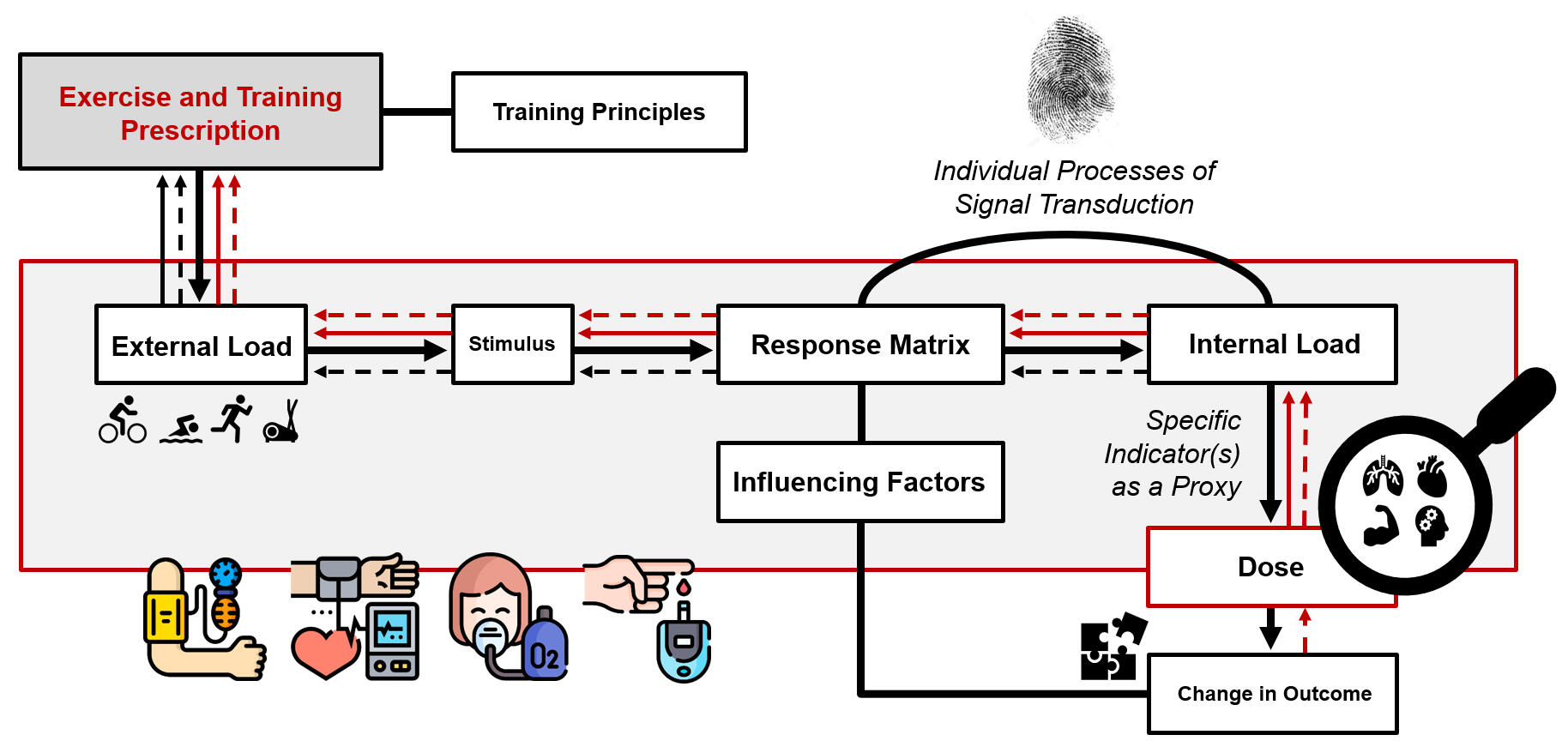 Consider a simple analogy with two people run on treadmills side-by-side at the exact same speed. They are exposed to an identical external load. However, one might be a seasoned marathoner whose heart rate is a steady 130 bpm, while the other is a beginner who is completely exhausted with a heart rate of 180 bpm. They are experiencing vastly different internal loads. This distinction is the foundational reason why one-size-fits-all plans fail—they only control the work, not the physiological stimulus it creates.With regard to our definition of dose, and given that internal load as acute response is a part of dose, the term “response” in the frequently used phrase “dose-response (relationship)” should be specified as “chronic response” (effect on a specific outcome parameter, e.g., mitochondrial volume and density) in the meaning of adaptation as a potential result of several and consecutive sessions of physical exercise. To be even more precise and to broaden the understanding of the dose-response relationship, we recommend redefining the phrase “dose-response” as “dose-outcome”, which specifies the link to an acute outcome parameter (in regard to a single bout of physical exercise) or a chronic outcome parameter (in regard to repeated bouts of physical exercise defined as training) according to the respective objective(s). In this context, dose could be seen as an independent variable or a set of independent variables which we assume to be involved in biological processes in general and in a complex response matrix and signal transduction, specifically leading to a distinct “outcome” (dependent variable). However, according to the definitions, internal load as proxy of the dose could be controlled by modifying the external load in consideration of exercise and training principles (e.g., periodization for the planned systematic and structural variation of a training program over time with an adequate relationship of load and recovery periods) and influencing factors such as the actual state of the psychophysiological capacity level (including level of performance).Given that an adequate exercise and/or training prescription is pivotal to administering an effective dose, this ongoing debate might produce major sources of difficulty in implementing physical exercise as medicine. Having said this, such a debate also entails great potential to serve as a promising starting point for fostering progress in both research and practical settings. To contribute to this debate, we will explain different approaches to prescribing and tailoring physical interventions from this perspective by highlighting their potential impact on interindividual heterogeneity regarding health- and perforamnce-related outcomes.