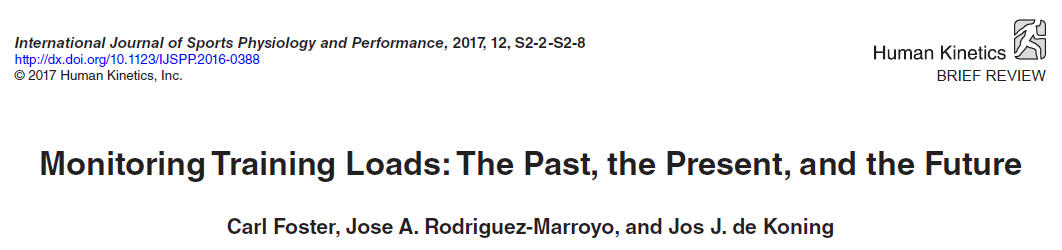 Foster, C., Rodriguez-Marroyo, J. A., & de Koning, J. J. (2017). Monitoring Training Loads: The Past, the Present, and the Future. International Journal of Sports Physiology and Performance, 12(Suppl 2), S22–S28. https://doi.org/10.1123/ijspp.2016-0388