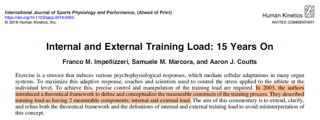 Impellizzeri, F. M., Marcora, S. M., & Coutts, A. J. (2019). Internal and External Training Load: 15 Years On. International Journal of Sports Physiology and Performance, 14(2), 270–273. https://doi.org/10.1123/ijspp.2018-0935